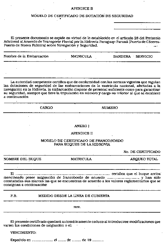 PROTOCOLO ADICIONAL AL ACUERDO DE TRANSPORTE FLUVIAL POR LA HIDROVIA PARAGUAY-PARANA (Puerto de Cáceres - Puerto de Nueva Palmira) SOBRE NAVEGACION Y SEGURIDAD Los Plenipotenciarios de la República Argentina, de la República de Bolivia, de la República Federativa del Brasil, de la República del Paraguay y de la República Oriental del Uruguay, debidamente autorizados por sus respectivos Gobiernos, según poderes otorgados en buena y debida forma, convienen en suscribir el presente Protocolo Adicional al Acuerdo de Transporte Fluvial por la Hidrovía Paraguay-Paraná. TITULO I DISPOSICIONES GENERALES Artículo 1. — Objeto. Las disposiciones de este protocolo y sus reglamentos complementarios serán aplicables sólo a las embarcaciones de la Hidrovía, a excepción de las normas comprendidas en el Título VII, las cuales serán de aplicación a todos los buques y embarcaciones que utilicen la misma. Artículo 2. — Régimen sancionatorio. Los países signatarios adoptarán un régimen sancionatorio único aplicable a las infracciones cometidas a las normas del presente Protocolo y sus reglamentos complementarios. Artículo 3. — Adaptación de instrumentos internacionales. Los países signatarios establecerán un régimen único de aplicación de cada convenio o instrumento internacional adoptado en este Protocolo cuando consideren necesario su adecuación al ámbito fluvial. Sin perjuicio de ello, dichos convenios serán aplicados hasta la aprobación del régimen citado. TITULO II NORMAS DE SEGURIDAD RELATIVAS A LAS EMBARCACIONES Y A LA CARGA CAPITULO I Luces y Marcas Artículo 4. — Régimen Normativo. Se adopta, en lo que a Luces y Marcas se refiere, el Convenio sobre el Reglamento Internacional para Prevenir los Abordajes (COLREG, Londres, 1972). CAPITULO II Certificados de Seguridad Artículo 5. — Emisión del Certificado. Los países signatarios deciden adoptar, para la emisión del Certificado de Seguridad de la Navegación, el formato que se agrega como Apéndice I. Artículo 6. — Régimen de Inspecciones. Los países signatarios adoptarán un reglamento único simplificado para la inspección de las embarcaciones de la Hidrovía, que garantice el cumplimiento de condiciones mínimas de seguridad, debiendo contemplar dicho documento las especialidades de casco, máquinas, armamento, electricidad y equipos de comunicación así como la inspección inicial. Artículo 7. — Expedición del Certificado. El Certificado de Seguridad de la Navegación será expedido por la autoridad competente del Estado de la bandera de la embarcación, conforme a los plazos que se establezcan en el reglamento único señalado en el artículo precedente. Los Certificados emitidos por las sociedades de clasificación reconocidas en el ámbito internacional, serán válidos en la Hidrovía, previo convenio de dichas sociedades con la autoridad. Artículo 8. — Caducidad del Documento. Operará la caducidad del certificado de Seguridad de la Navegación cuando expire el plazo de validez o se comprobare la pérdida de las condiciones de seguridad de la embarcación o fuere eliminada de la Matrícula Nacional. Artículo 9. — Responsabilidad. La autoridad competente de cada país signatario será responsable de la verificación del cumplimiento de esta normativa, sin perjuicio de la responsabilidad del propietario, armador o su representante legal por el incumplimiento del presente régimen. CAPITULO III Seguridad de Embarcaciones Tanques Artículo 10. — Régimen Normativo. La seguridad de embarcaciones tanques se regirá de acuerdo a las disposiciones previstas, para el efecto, en el Convenio Internacional para la Seguridad de la Vida Humana en el Mar (Londres, 1974, sus Protocolos y Enmiendas). Los países signatarios acordarán simplificaciones respecto de las embarcaciones no propulsadas o menores de 500 toneladas de arqueo bruto. CAPITULO IV Arqueo de Embarcaciones y Asignación de Francobordo Artículo 11. — Arqueo de Embarcaciones. Los países signatarios deciden adoptar para el arqueo de las embarcaciones el Convenio Internacional sobre Arqueo de Buques (Londres, 1969). Artículo 12. — Francobordo. Los países signatarios adoptarán y emitirán un documento único de francobordo para embarcaciones de la Hidrovía. El plazo de validez en ningún caso excederá el del Certificado de Seguridad de la Navegación. Artículo 13. — Reglamento. Los países signatarios elaborarán un reglamento único para la asignación de francobordo para las embarcaciones de la Hidrovía, a ser aplicados por las autoridades competentes de los países signatarios. CAPITULO V Seguridad de la Carga SECCION 1 Disposición General Artículo 14. — Reglamento. Los países signatarios podrán elaborar un reglamento único para la seguridad de las cargas transportadas no normadas en el presente Capítulo. Artículo 15. — Responsabilidades. Las autoridades competentes de los países signatarios verificarán el cumplimiento de lo dispuesto en la presente normativa. SECCION 2 Transporte de Mercancías sobre Cubierta Artículo 16. — Certificado de Troja. Todas las embarcaciones que transporten carga sobre cubierta, deberán estar autorizadas por la autoridad competente del Estado del pabellón de la embarcación, la que emitirá un certificado de troja, por sí o por delegación. El mismo tendrá en consideración la incidencia de la carga en la estabilidad de la embarcación, la resistencia de la zona de apoyo, la accesibilidad, el trincado de las mercancías y la incidencia de éstas en la visibilidad. Artículo 17. — Régimen Normativo. Los países signatarios adoptarán un reglamento único para el transporte de mercancías sobre cubierta. Hasta tanto el reglamento no sea elaborado no podrán transportarse mercancías sobre cubierta en: a) Embarcaciones del tipo tanque, cuando transporte productos con punto de inflamación menor de 70 grados C; b) Embarcaciones que transporten más de doce pasajeros