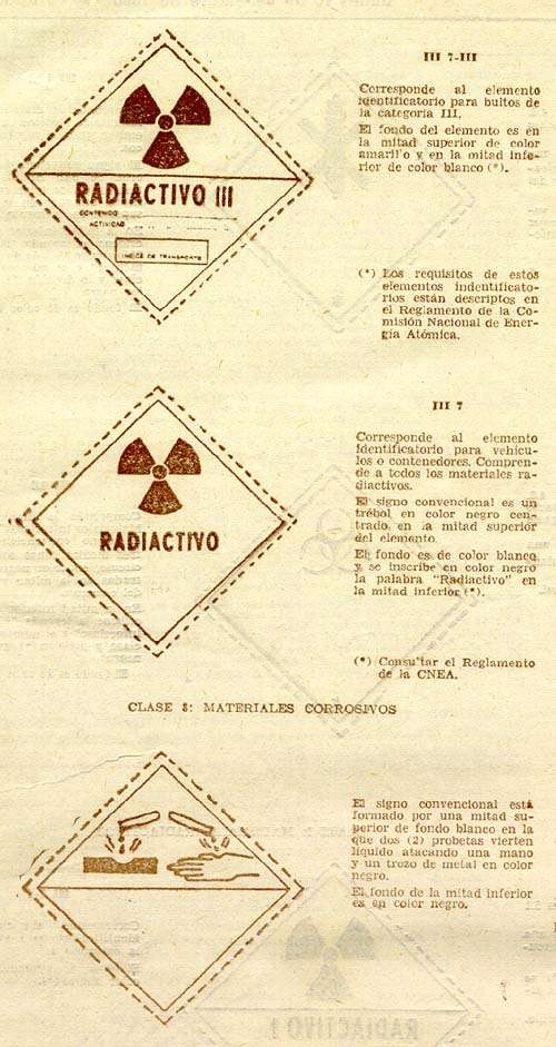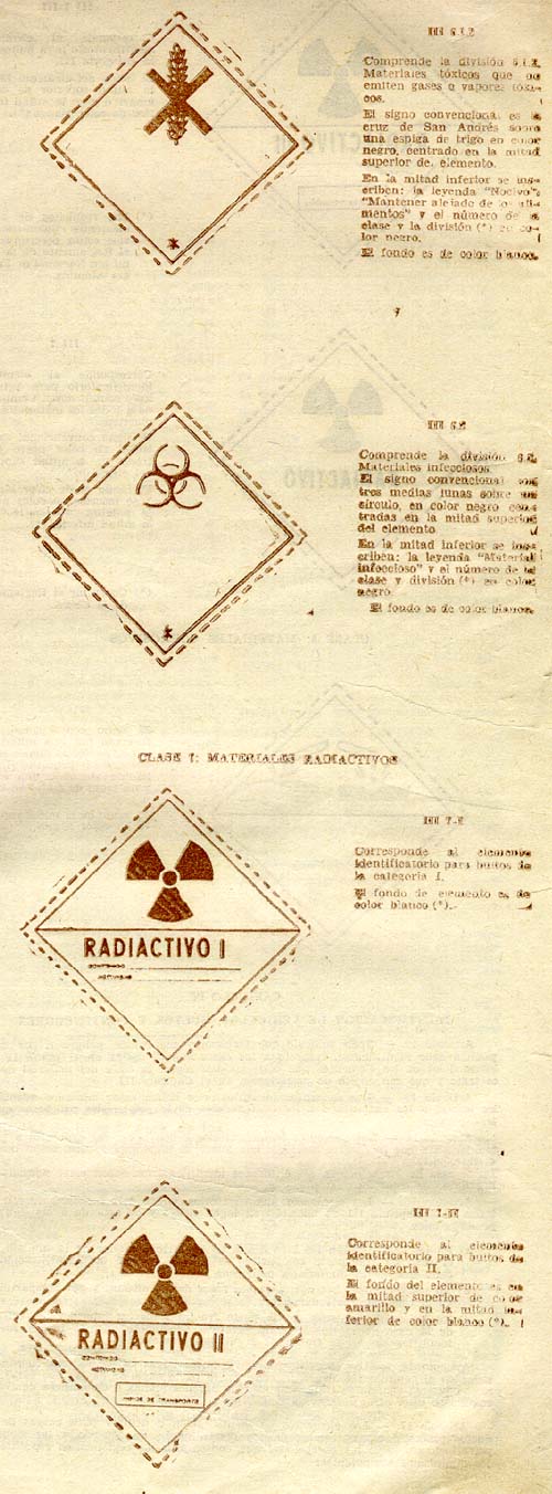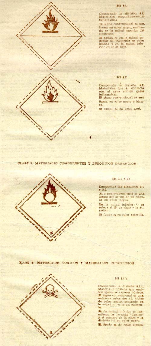 CAPITULO III ELEMENTOS IDENTIFICATORIOS; FORMAS, TAMAÑOS Y MODELOS 11. - Las características de los elementos identificatorios son las siguientes: a) FORMA: Los elementos identificatorios estarán formados por un cuadrado apoyado sobre uno de los vértices y tendrán el tamaño y los símbolos que se describen a continuación. b) TAMAÑO: Los elementos que deberán ser colocados a los bultos tendrán como mínimo cien milímetros por cien milímetros (100 mm × 100 mm) de lado, con excepción de aquellos que tengan que ser colocados a bultos de menor tamaño que el fijado para las identificaciones, siempre que el Reglamento específico permita el uso de bultos de dimensiones inferiores a cien milímetros (100 mm) de lado. Los elementos que deberán ser colocados en los vehículos, cisternas o contenedores tendrán como mínimo doscientos cincuenta milímetros por doscientos cincuenta milímetros (250 mm × 250 mm) de lado. c) SIMBOLOS: En todos los elementos va trazada una línea de color negro a cinco milímetros (5 mm) del borde y tienen para cada clase o división, las siguientes figuras de referencia: CLASE 1: MATERIALES Y OBJETOS EXPLOSIVOS