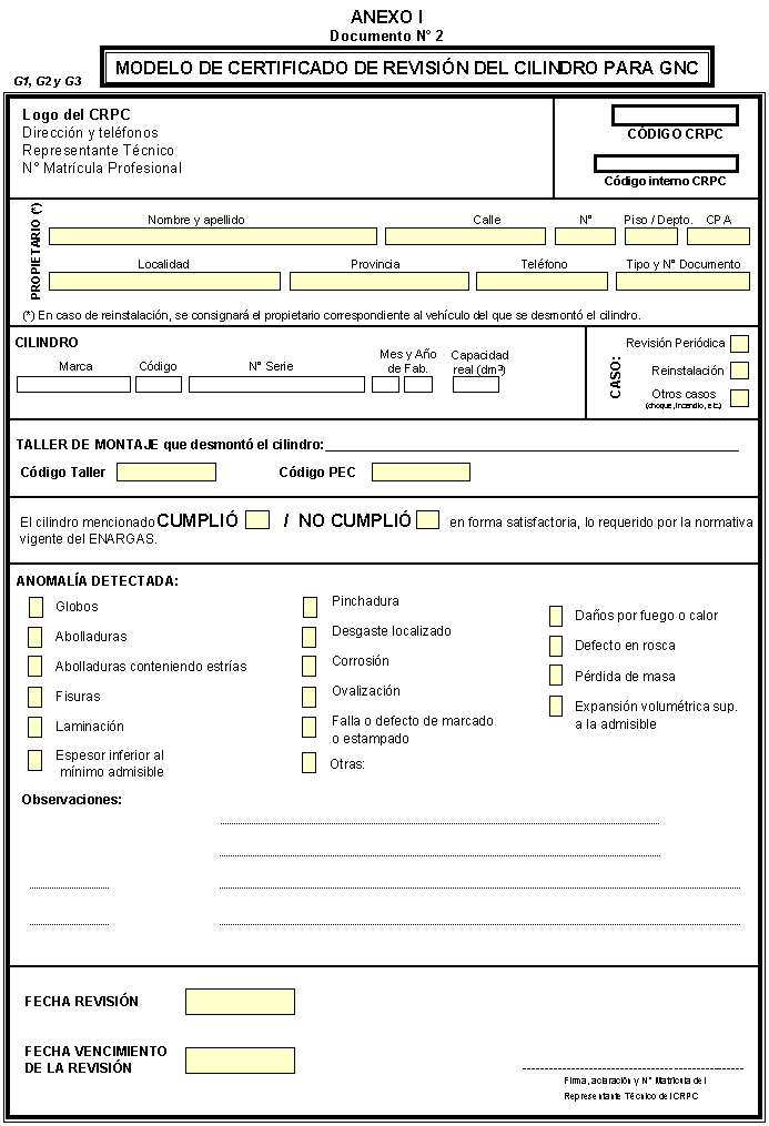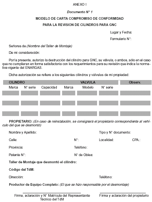 B.— Reinstalación del equipo: Cuando se trate de reinstalar un equipo de un vehículo automotor a otro se deberá tener en cuenta lo siguiente: B.1 Previo a la reinstalación de un equipo, se deberá verificar su desmontaje efectuado por un TdM, conforme a lo indicado en el punto C.2. B.2 El TdM no podrá reinstalar ningún componente del equipo completo que no haya sido previamente aprobado por un Organismo de Certificación reconocido por el ENARGAS, independientemente si el fabricante o importador esté o no actualmente en el mercado o que no haya renovado la homologación correspondiente, para lo cual seguirá las recomendaciones dadas por el PEC. B.3 Unicamente podrán reinstalarse los reguladores de presión o cilindros para GNC cuyo código de homologación figure en el listado de componentes aprobados, según consta en el registro del ENARGAS. B.4 El TdM controlará todas las partes constitutivas del equipo y aquellos componentes que posean fallas en su funcionamiento serán reemplazados por partes nuevas. En todos los casos a fin de garantizar la seguridad de la instalación se cambiarán por elementos nuevos los siguientes componentes: tubería de alta presión, accesorios para conexión de la tubería, manguera de baja presión de conducción de gas y sistema de venteo. Para otorgar transparencia a la operación, los elementos reemplazados deberán inutilizarse y entregarse al usuario. B.5 En caso que el regulador de presión no posea grabado o consignado el código de homologación correspondiente o presente deficiencias de funcionamiento, deberá ser remitido a su fabricante o importador para ser verificado en banco de control, comprobar su correcto funcionamiento, calidad y seguridad y grabar el código correspondiente, emitiendo la garantía, que será entregada al PEC para que éste la adjunte con el resto de la documentación a proveer al usuario. Si no existiera su fabricante o importador o éstos se encontraren inhabilitados, las tareas indicadas en el párrafo anterior podrán ser efectuadas por cualquier otro fabricante o importador habilitado, haciéndose responsable de tales tareas. Asimismo, el PEC deberá consignar en el campo "Observaciones" de la Ficha Técnica la siguiente leyenda: "Regulador de presión para GNC verificado por (indicar el fabricante o importador que realizó la tarea)". B.6 Previo a desmontar un cilindro de un vehículo para ser instalado en otro, el TdM deberá observar el procedimiento indicado en el punto C.2. De corresponder, el cilindro será remitido a un CRPC —junto con su válvula de bloqueo— cualquiera sea la fecha de su última revisión o de fabricación. El TdM confeccionará en forma completa la carta compromiso firmada por el usuario, teniendo en cuenta que los números de oblea y patente, correspondan a los del vehículo del que se desmontó. B.7 En el caso que el cilindro sea remitido por el usuario, el CRPC deberá solicitar su documento de identidad y sacar copia del mismo a los efectos de corroborar los datos, archivándola junto con la carta compromiso y procederá según lo indicado en B.8. B.8 El CRPC deberá, previo a la revisión del cilindro, consultar en el SICGNC su historial y verificar la totalidad de la información de la carta compromiso. Si resultare un historial con IDI no podrá efectuar la revisión del cilindro para lo cual lo devolverá al remitente, incorporará al Registro IDI los datos completos que figuran en la carta compromiso cuando no hayan sido ingresados previamente por el PEC, procederá a tachar en el certificado de revisión la leyenda "El cilindro mencionado CUMPLIO/NO CUMPLIO en forma satisfactoria, lo requerido por la norma vigente del ENARGAS.", y se dejará constancia en el campo correspondiente a observaciones, la siguiente leyenda: "Cilindro no revisado por estar registrado con IDI en el SICGNC". En el caso particular de un cilindro cuyo número de serie y código de homologación pudieran coincidir con los del instalado en otro vehículo, sólo podrá autorizarse la revisión del cilindro que se trata, siempre que se verifique la trazabilidad de sus datos, no obstante lo cual se lo incorporará al Registro IDI y, se dejará constancia en el campo correspondiente a observaciones del certificado de revisión con la siguiente leyenda: "Cilindro revisado y registrado con IDI por detectarse duplicidad en el número de serie y código de homologación". Si resultare un historial sin IDI el CRPC procederá a imprimir la consulta y someter el cilindro a los controles requeridos en la normativa de aplicación para su revisión. En este caso, sólo se efectuará el ensayo de prueba hidráulica con expansión volumétrica cuando la fecha de fabricación o última revisión, según corresponda, determine su vencimiento. Posteriormente y de resultar satisfactoria la revisión, el CRPC emitirá los tres ejemplares del certificado de revisión y procederá conforme lo indicado en A.5. Dicho certificado habilitará al cilindro hasta cumplimentar el período estipulado en las normas de fabricación y/o revisión o por un nuevo período, según corresponda con lo indicado en el párrafo precedente. Asimismo, el CRPC además de proceder a efectuar el marcado indicado en la norma de aplicación, grabará el código del cilindro conforme lo establecido en B.3. B.9 En el caso en que el TdM recibiera de parte del CRPC un cilindro aprobado con IDI de acuerdo con lo indicado en D.2, deberá solicitar y sacar copia del documento de identidad el usuario, a los efectos de corroborar los datos y la remitirá junto con el ejemplar de la Ficha Técnica que quedará en poder del PEC y procederá a su reinstalación. En el caso en que el TdM recibiera de parte del CRPC un cilindro sin revisar con IDI, deberá solicitar y sacar copia del documento de identidad del usuario, a los efectos de corroborar los datos y la archivará junto con el ejemplar G2 del certificado de revisión que se remitirá al PEC y devolve