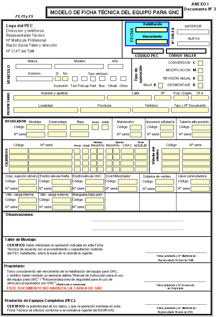 A.8 El PEC deberá arbitrar los medios necesarios para cerciorarse que el RTTdM interviniente realice la efectiva supervisión de las instalaciones por él habilitadas. En tal sentido y, con el objeto de obtener un doble control, los Representantes Técnicos del PEC (RT) podrán serlo también del TdM sólo en el caso que el TdM se encuentre ubicado en las instalaciones del PEC. El RTTdM será un Ingeniero o Técnico Mecánico. Otros títulos habilitantes que lo faculte para actuar en el tema, podrán ser admitidos, siempre que el Consejo Profesional correspondiente acredite su competencia. Dicha acreditación deberá ser conservada por el PEC habilitante junto con el resto de los antecedentes correspondientes al TdM. Asimismo, deberá estar matriculado como gasista de primera categoría ante una Licenciataria de Distribución de Gas. Cada vez que se produzcan cambios de RTTdM, el PEC los informará al ENARGAS, conforme lo indicado en el Documento N° 4. A.9 El PEC controlará y completará los datos consignados en la Ficha Técnica, asignando a la operación una Oblea de vigencia de la habilitación del equipo para GNC numerada (en adelante, oblea), según lo indicado en el Documento N° 6 del Anexo IV de la Resolución ENARGAS N° 139/95. Posteriormente, ingresará los datos de la operación a su sistema informático y emitirá la Cédula de Identificación del Equipo para GNC (en adelante, tarjeta amarilla) de acuerdo con los Documentos N° 1 y 2 del Anexo V de la Resolución N° 139/95 modificado por el Anexo II de esta Resolución, según corresponda. Asimismo, tildará en la tarjeta amarilla el casillero de: conversión, revisión anual o modificación y elementos nuevos (N) o usados (U), según corresponda. Finalmente, archivará su ejemplar F2 junto con la impresión de la consulta al SICGNC y, remitirá al TdM: