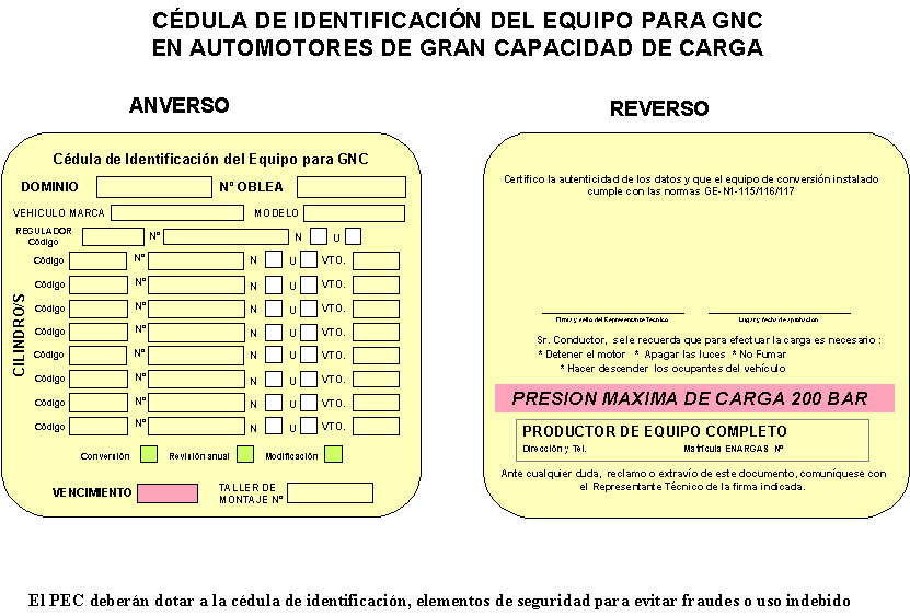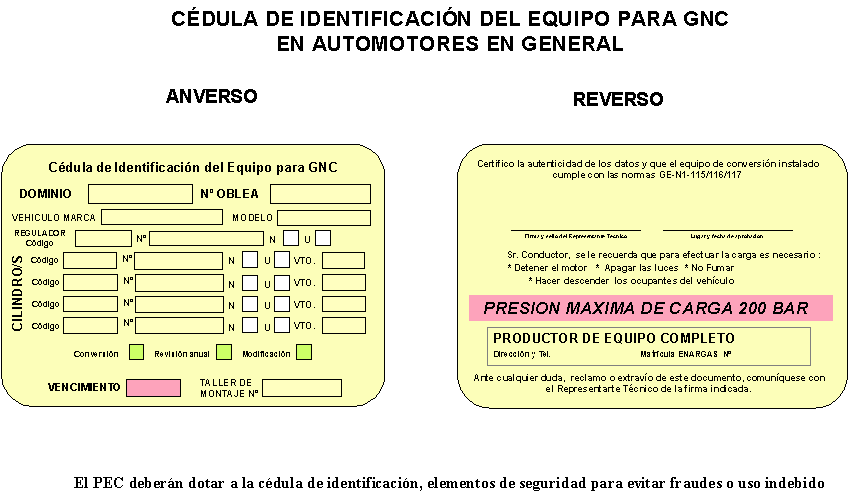 ANEXO II CEDULA DE IDENTIFICACION DEL EQUIPO PARA GAS NATURAL COMPRIMIDO (TARJETA AMARILLA)