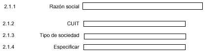 2.1.1 – Razón social: nombre con el cual esta inscripta la empresa. 2.1.2 – CUIT: número de clave única de identificación tributaria. 2.1.3 – TIPO DE SOCIEDAD: se ingresará aquella sigla que se asignó a la empresa (sa, srl, etc), se elige de una lista desplegable. 2.1.4. ESPECIFICAR: de no tener en 2.1.3 la opción de sigla correspondiente deberá asentar aquí la que corresponda. 2.2 - Representantes de la empresa Aquella persona autorizada legalmente a representar a la empresa.
