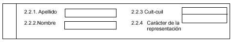 2.2.1 – APELLIDO: completo sin abreviatura (como figura en documento de identidad) 2.2.2 – NOMBRES: completo sin abreviatura (como figura en documento de identidad). 2.2.3 – CUIT/CUIL: número de clave única de identificación tributaria o previsional. 2.2.4. CARACTER DE LA REPRESENTACION: se ingresará la que corresponda: Representante legal, apoderado o titular. 2.3 - Domicilio Real domicilio real donde esta ubicada la "sede Central" de la empresa.